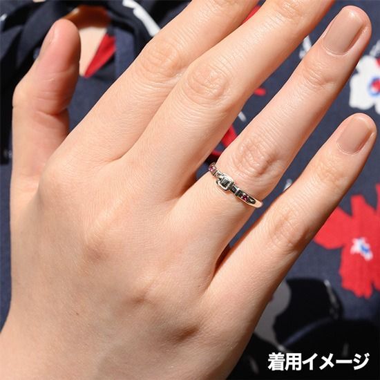 リングの表側はキャラクターの衣装や異能をイメージしデザイン、内側には名前の刻印と天然石をセットしています。