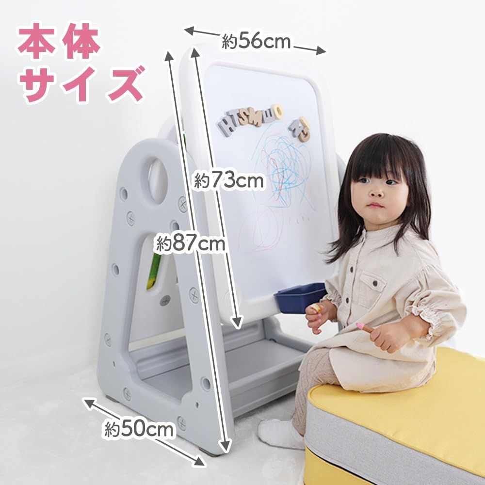 【2段階高さ調整可能】表面のホワイトボードはローとハイの2段階で高さの調整ができるから、成長に合わせて使えるのがうれしい♪成長とともに遊び方を変えていくこともできます!【ママもできる!5分で完成、2ステップ組み立て】特殊な工具は一切不要!付属の十字レンチを使って①パネルを組み合わせて②ナットを締めるだけの2ステップであっという間に組み立てることができるから、ママでも安心♪また本体は約4.8kgで掃除や移動も簡単です。【本体サイズ】W56×H73×D50cm、重さ約4.8kg【商品について】商品ページはイメージです。ホワイトボード用クレヨン、マーカー、クリーナー、収納BOX、マグネット等は付属しておりません。予めご了承ください。