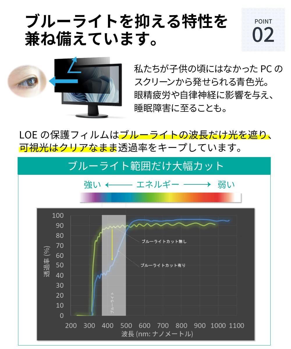 [ ブルーライトカット ] 私たちが子供の頃にはなかったPCモニターのスクリーンから発せられる青色光。 毒性の強いブルーライトは眼精疲労や体内リズムへの影響が益々懸念されています。 本製品は覗見防止効果を有しながら、ブルーライトを約50%低減。将来のことを考えるならブルーライトカット対応 パソコン 覗き見防止 フィルム がオススメです。AG面は反射率5.8%とアンチグレアで光の映り込みもほとんどありません。