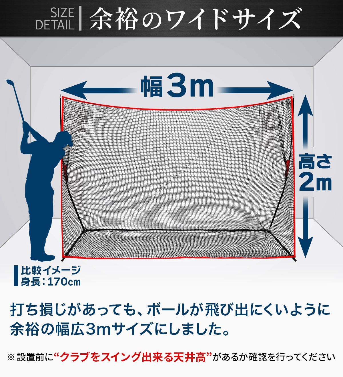 【余裕のワイドサイズと衝撃吸収】打ち損じがあっても、ボールが飛び出にくいように余裕のある幅広3mサイズを採用。また「2種類のフレーム」と「6本撚りのネット」にしたことで、衝撃吸収を追及した構造になっています。