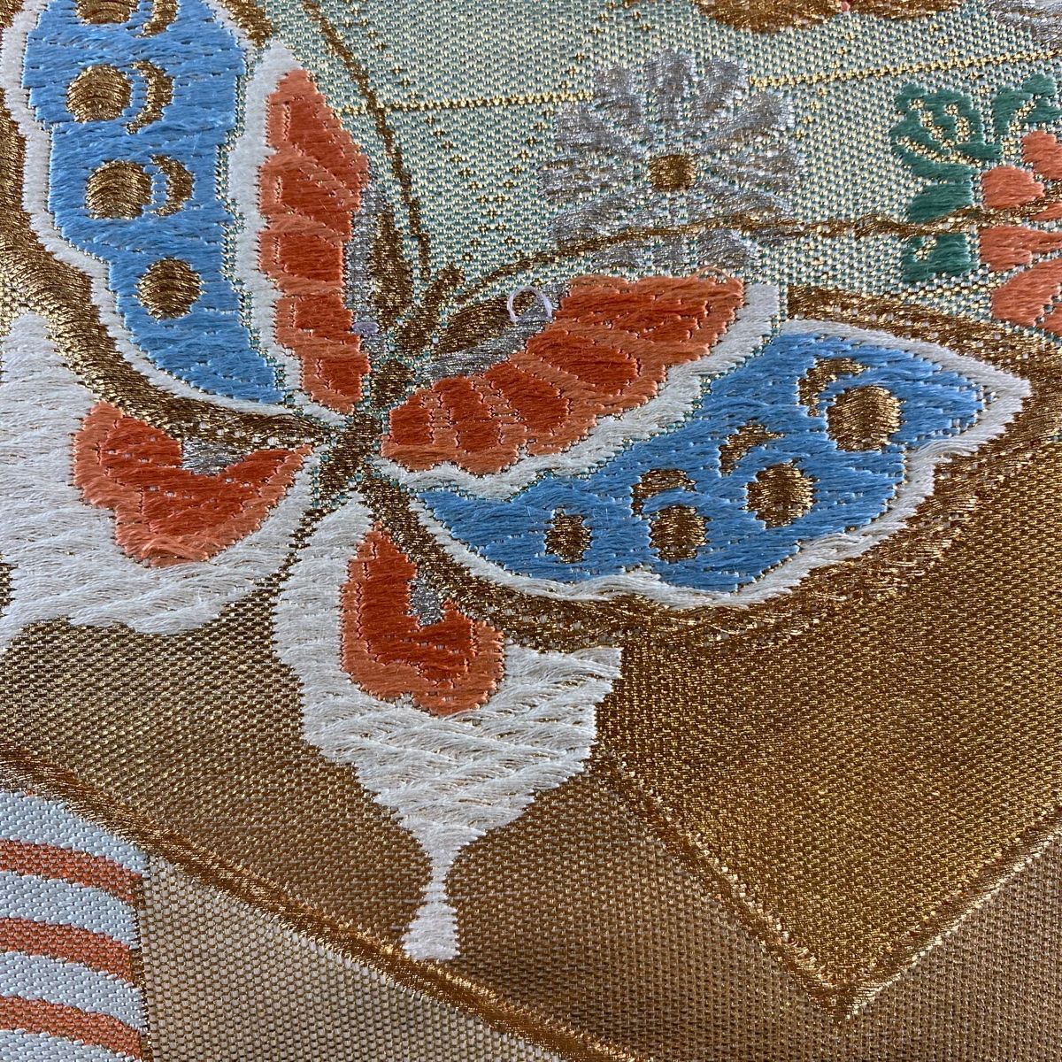 袋帯 秀品 蝶 色紙 金銀糸 刺繍 金色 六通 正絹