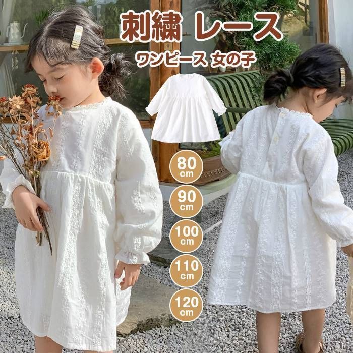 ワンピース 女の子 刺繍 レース 長袖 クルーネック 子供服 無地 キッズ 子供 子ども ベビー服 韓国風 90/100/110/120/130 旅行 リゾート ビーチ 春 夏 かわいい おしゃれ 白 ホワイト