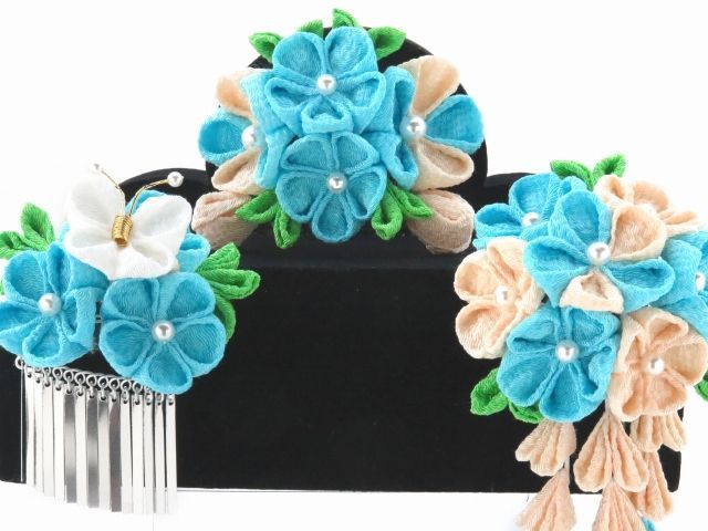 こども髪飾り’鈴音屋’手作り-ちりめん髪飾り 水色摘み藤に白の蝶 銀ビラ付き 3点セットSZN 743