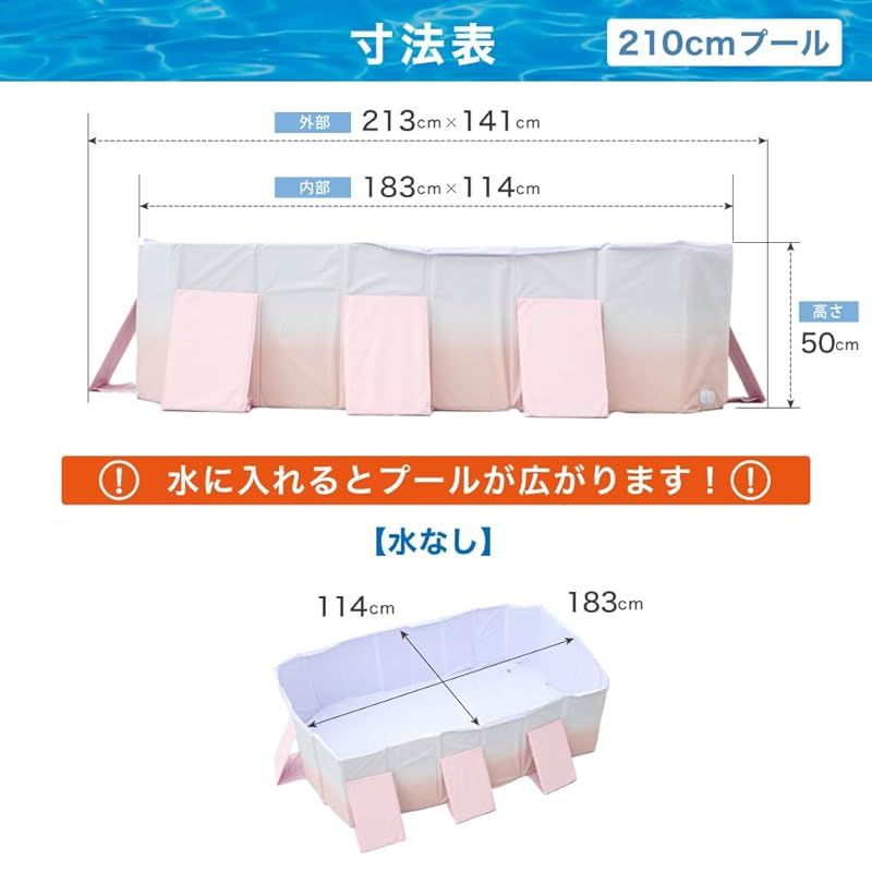 【 プール詳細 】(2.1m)サイズ:213×141×50cm (内径・水なし:183×114×50cm、・水あり:190×125×50cm)、梱包サイズ:51×53×14cm。(2.5m)サイズ:255×150×50cm (内径・水なし:225×120×50cm)、 (3.0m)サイズ:300×171×50cm (内径・水なし:270×141×50cm、・水あり:285×164×50cm)、梱包サイズ:55×65×15cm。