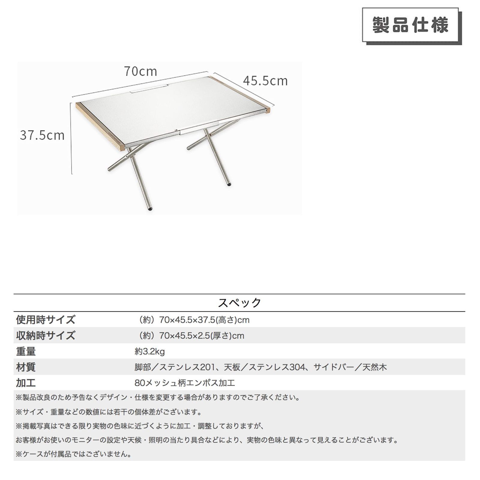 材質:テーブルトップ/ステンレス304(t0.8mm厚・特殊エンボス加工)、サイド/天然木、スタンド/ステンレス201(径19mm)