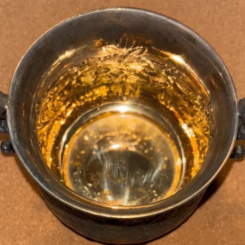 両取っ手・全面に花模様のエンボス彫刻はデザインから見ると1950〜1970年代頃のイタリア製銀細工の典型的スタイルとなります。