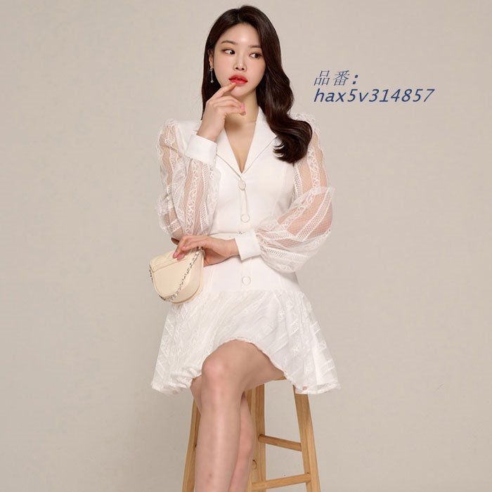 襟付きカシュクール シースルー長袖フ ミニスカートワンピース 白 キャバ スナック セクシー 韓国 ドレス hax 5 v 314857