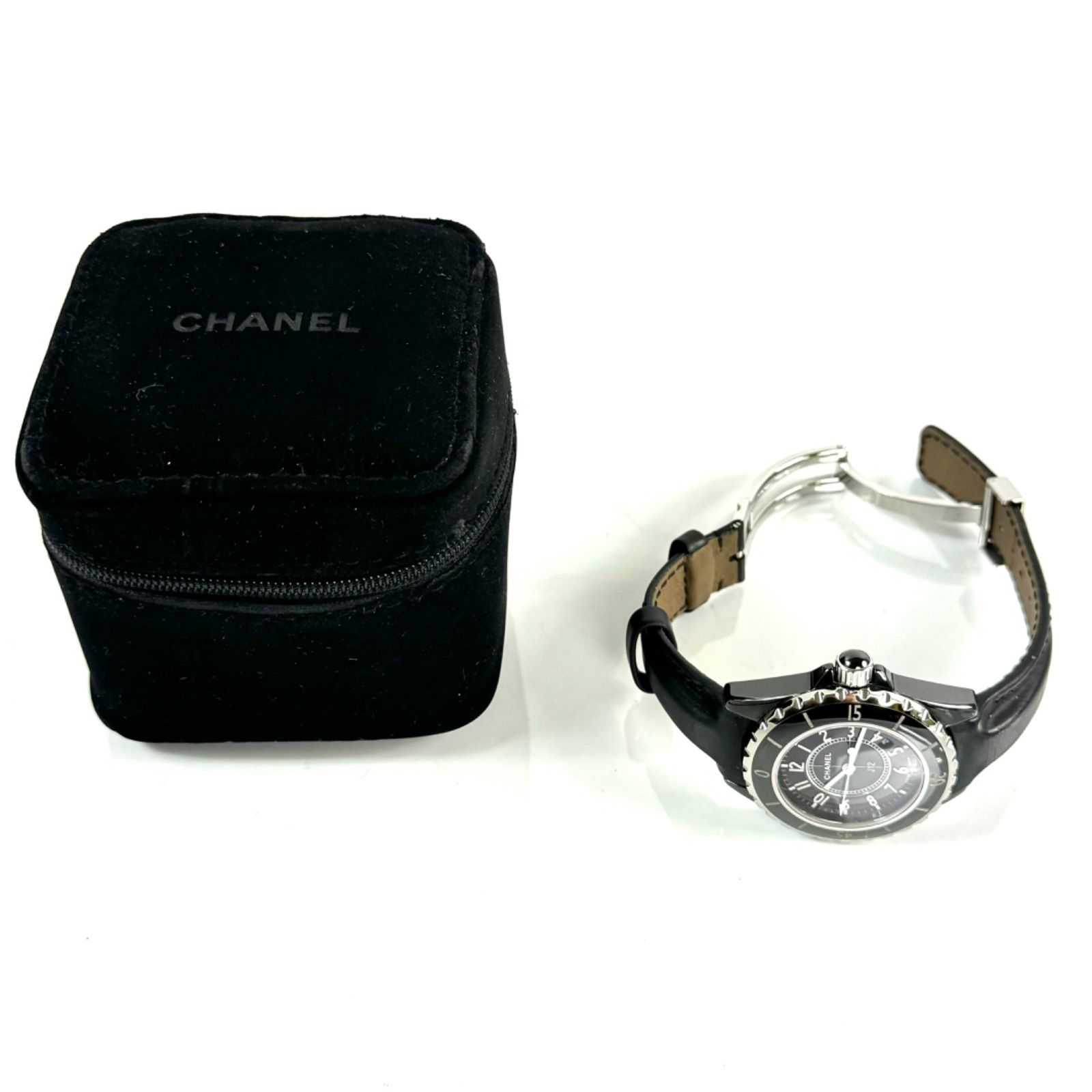 シャネル CHANEL J 12 H 0680 クォーツ 黒 セラミック デイト表示 革ベルト レディース