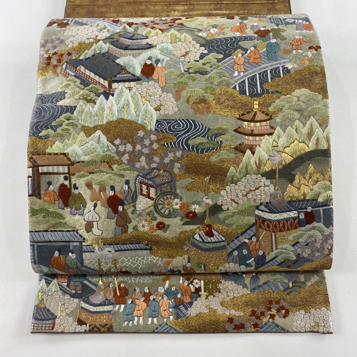 袋帯 御所風景 人物 金糸 刺繍 金茶 お太鼓柄 正絹