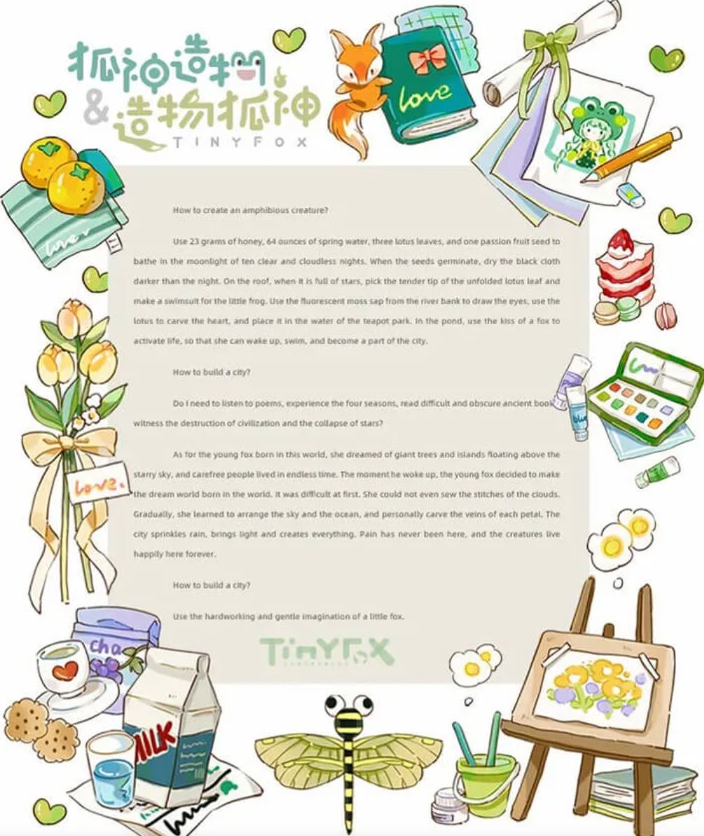 この世界に生まれた若いキツネはといえば、星空の上に浮かぶ巨大な木々や島々、果てしない時間の中でのんびりと暮らす人々の夢を見ていた。目が覚めた瞬間、若狐はこの世界に生まれた夢の世界を作ろうと決心した。最初は難しかった。雲の縫い目さえ縫えなかった。徐々に、彼女は空と海を配置し、花びら一枚一枚の葉脈を彫ることを学んだ。街は雨を降らせ、光をもたらし、すべてを創造する。苦しみはここにはなく、生き物たちは永遠にここで幸せに暮らしている。