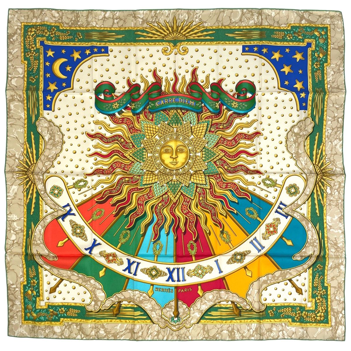 エルメス HERMES カレ 90 CARPE DIEM 今日一日を楽しむ 太陽 月 星 スカーフ シルク グリーン マルチ レディース