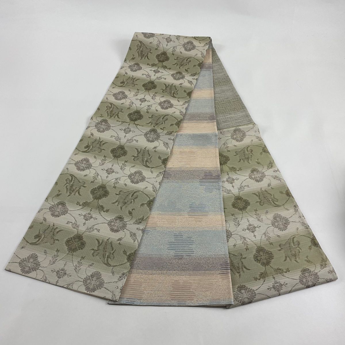 袋帯 秀品 花唐草 段縞 金糸 灰緑 六通 正絹