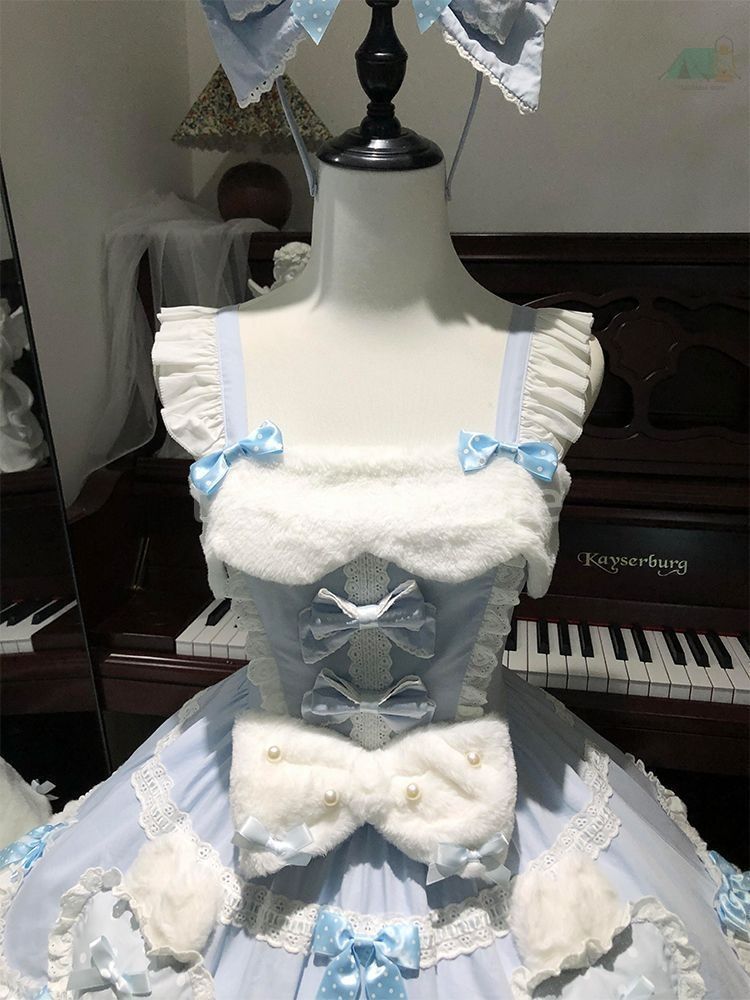 冬の静かな雪景色を思わせる、甘く可憐な「スノーエレジー(雪の詩)」をテーマにしたロリータワンピースセット。透き通るようなブルーと、ふんわりとしたシルエットが、冬の小清新(クリーンで爽やか)な魅力を存分に表現します。