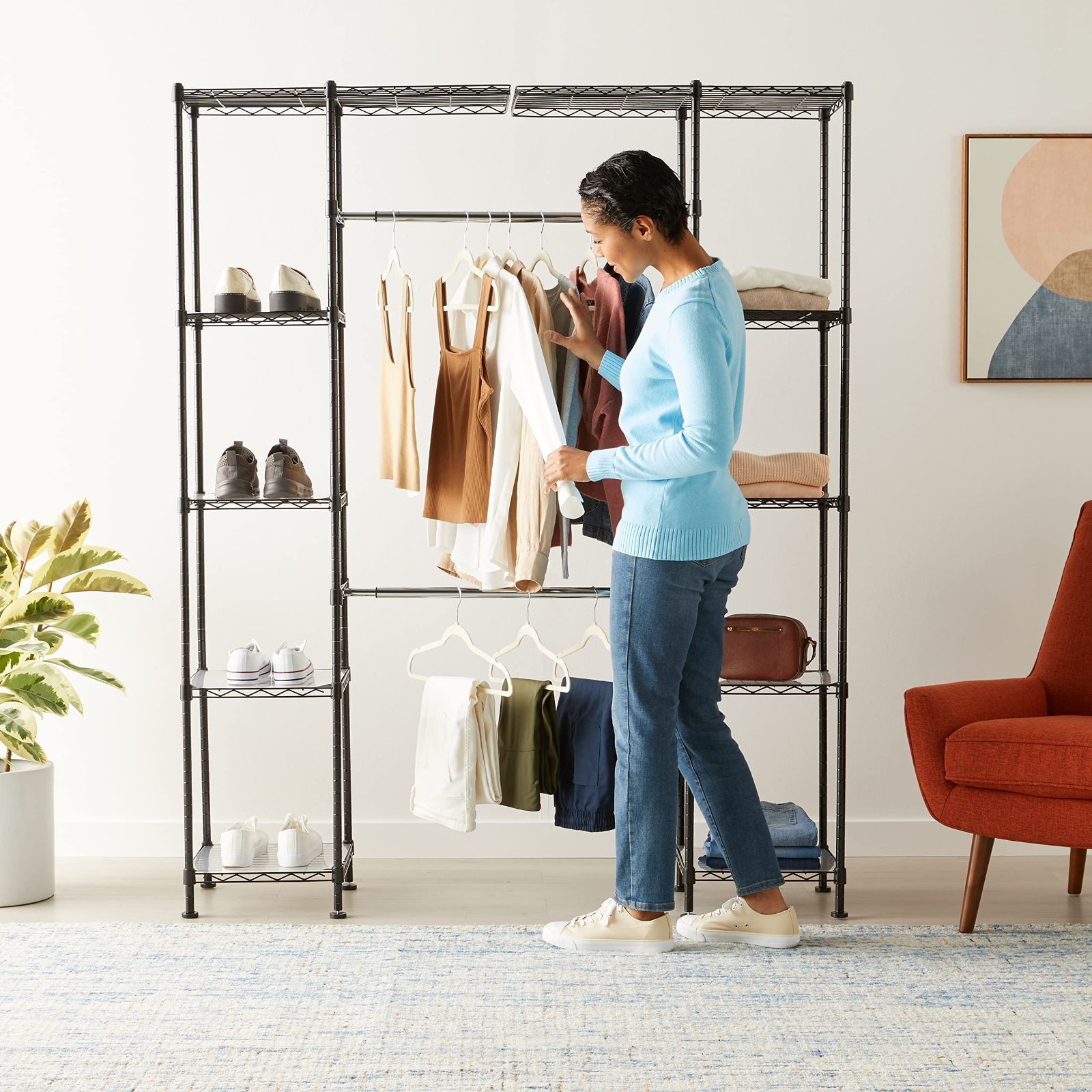 ベーシック ハンガー ラック 金属製 クローゼット収納 延長可能 ワードローブ 棚付き 144.8-203.2x35.6x182.9cm ブラック