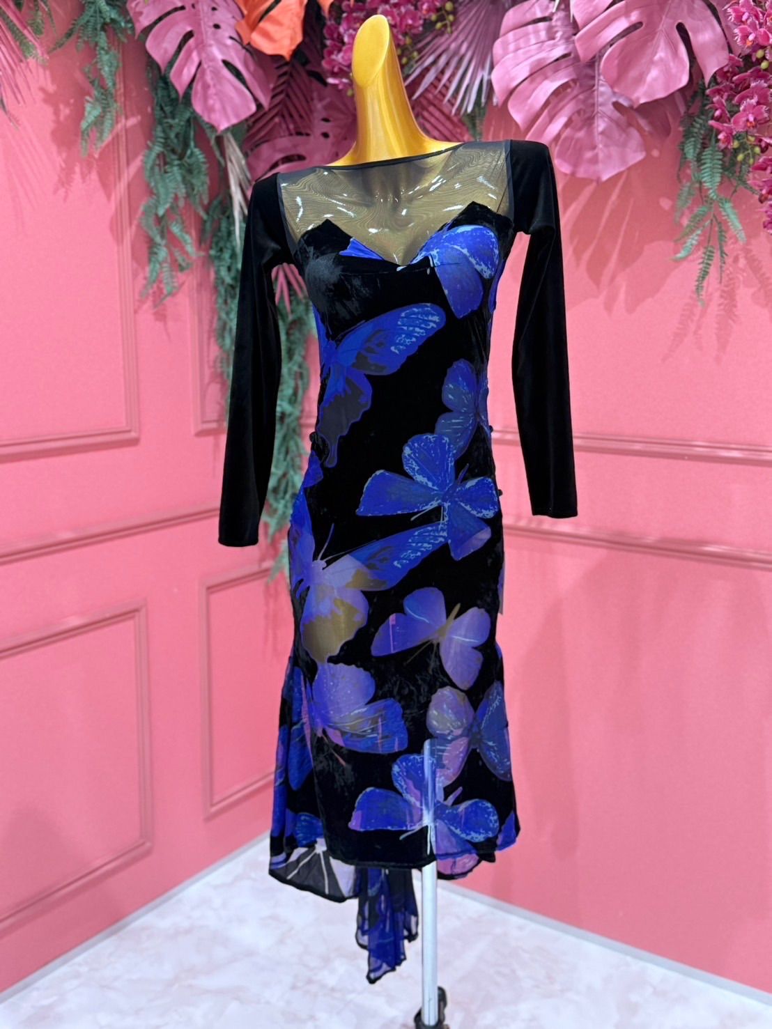 社交ダンス gentil ジャンティ 青蝶×黒 Mサイズ ラテンワンピース ブラック