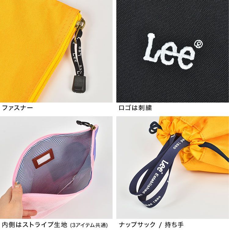 新入学・新学期の必須アイテム!大人気ブランド「Lee(リー)」のレッスンバッグ・ナップサック・シューズケース・ランドセルカバーと巾着袋3サイズ(S/M/L)の7点がセットになりました。バッグとランドセルカバーは撥水生地を採用しているので雨の日も安心◎巾着袋は通気性の良い綿素材でお手入れ簡単!男の子も女の子も使えるおしゃれなカラーが揃っています。入園・入学の準備や買い替え、プレゼントにもおすすめです♪