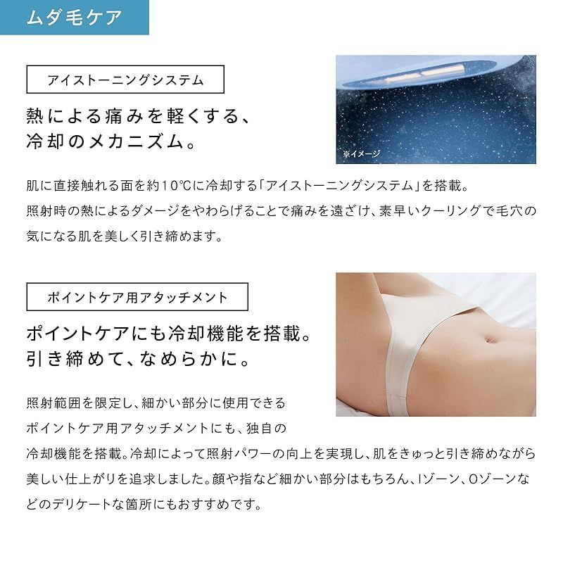 【ムダ毛ケア】ポイントケアにも冷却機能を搭載。引き締めて、なめらかに:照射範囲を限定し、細かい部分に使用できるポイントケア用アタッチメントにも、独自の冷却機能を搭載。冷却によって照射パワーの向上を実現し、肌をきゅっと引き締めながら美しい仕上がりを追求しました。顔や指など細かい部分はもちろん、Iゾーン、Oゾーンなどのデリケートな箇所にもおすすめです。