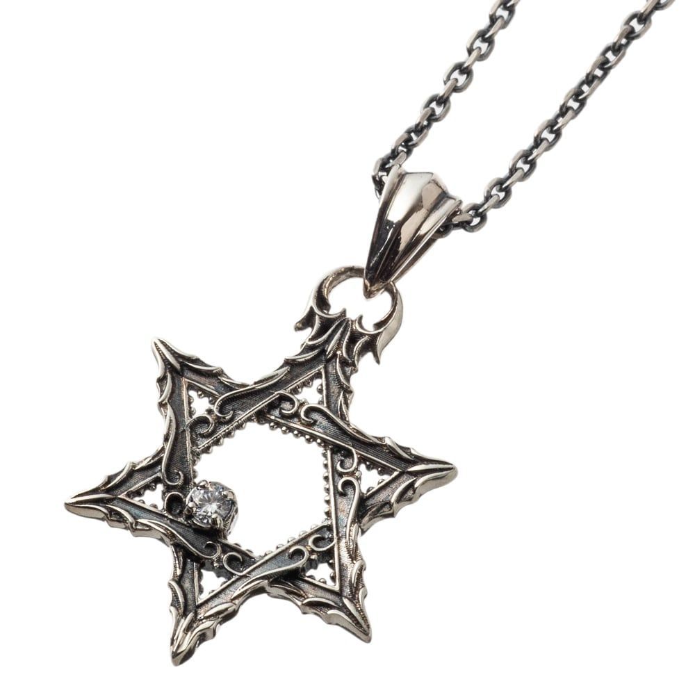 胸元に宿るのは、古来より「魔よけ」や「幸運を呼ぶ」とされる六芒星のシンボル。精緻に組み上げられたそのフォルムは、ただのモチーフにとどまらず、洗練された造形美と象徴性を併せ持ちます。アンティーク調の装飾が施された立体的な彫り込みは、光と影を巧みに操り、角度ごとに異なる表情を描き出します。センターに煌めくクリアストーンは、繊細な輝きを添えながら全体を凛と引き締め、上品でモダンな気配を漂わせます。程よいサイズ感は日常に溶け込みつつも、特別なシーンでは存在感を放ち、装う人の個性を静かに際立たせます。アトリエにて熟練の職人が一点一点丹念に仕立てた本作は、オブジェのような存在。身に着けることで、まるで守護の力と気品を同時に纏うような特別な感覚を与えてくれる逸品です。