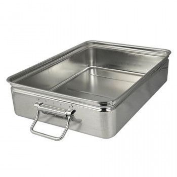 食品工場、給食センターなどで食材や料理の運搬、保管に広く使われているバットです。食材や料理を入れた状態で積み重ねができます。耐久性と耐食性に優れたステンレス製です。可動取手付です。