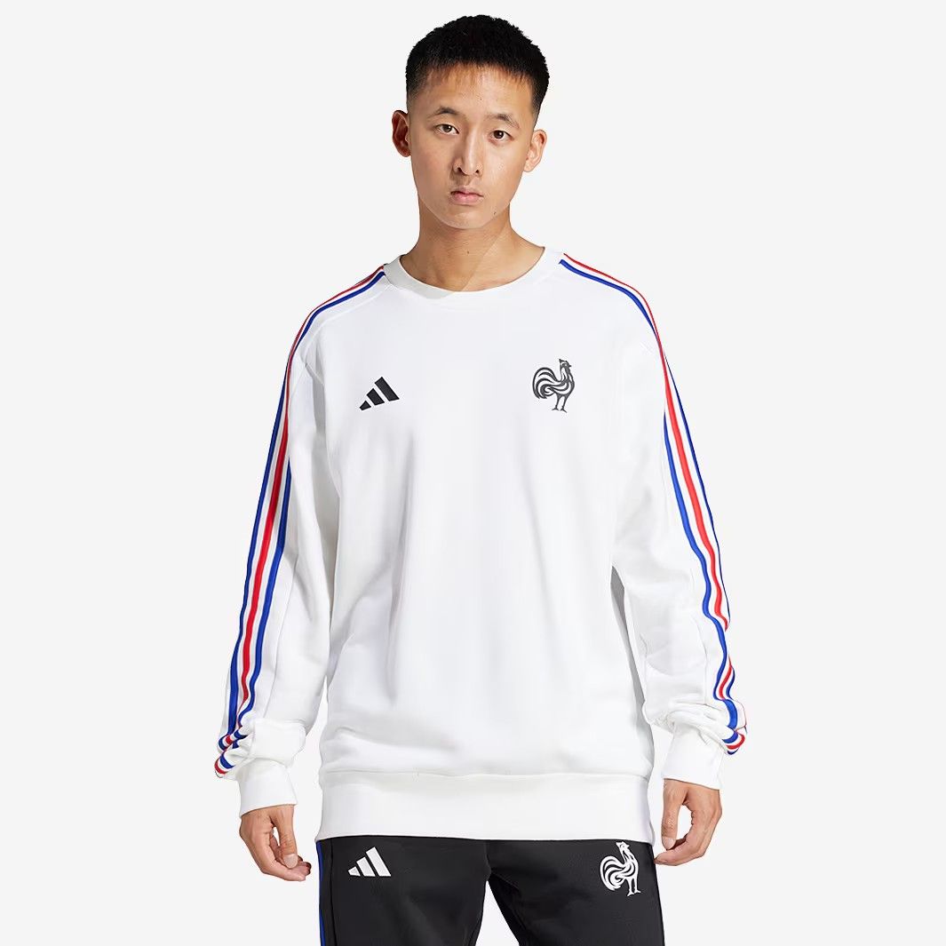 アディダス製のフランス代表公式ファンウェアクルーシャツです。超ソフトな100%コットンフレンチテリー生地が最高の快適さを提供します。伝説的なガリアの雄鶏クレストとフランスのトリコロールカラーのディテールが愛国心を示します。リブ編みのクルーカラー、裾、袖口が付いたレギュラーフィットモデルです。