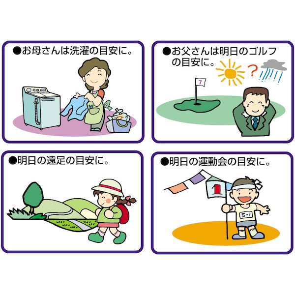 ●気圧センサを内蔵し気圧の変化から約半日後のお天気傾向を「晴」「快方に向かう」「下り坂」「雨」の4つのシグナルでお知らせ。