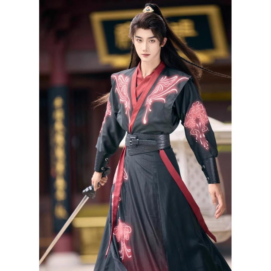 職人製作 メンズ 漢服 5点セットアップ おしゃれ 暗黒 武侠風 チャイナ服 中国古代服装 男性 大人 ジュニア 蛍光感のプリント 黒に赤 緑 動きやすい