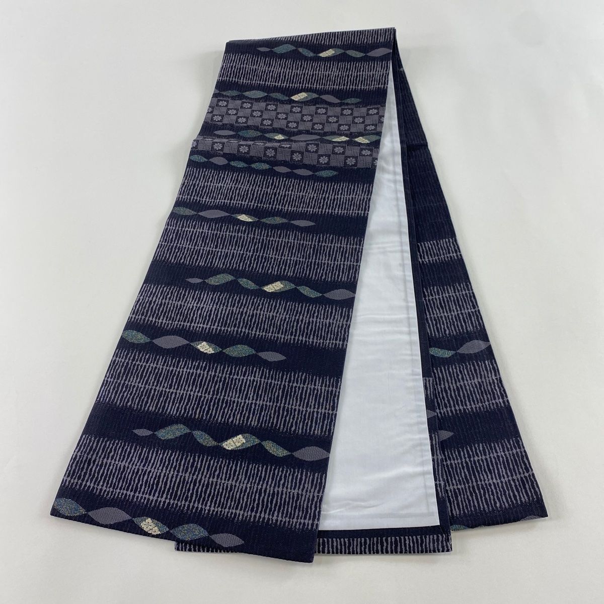 開き名古屋帯 秀品 段縞 花菱 箔 濃紫 正絹