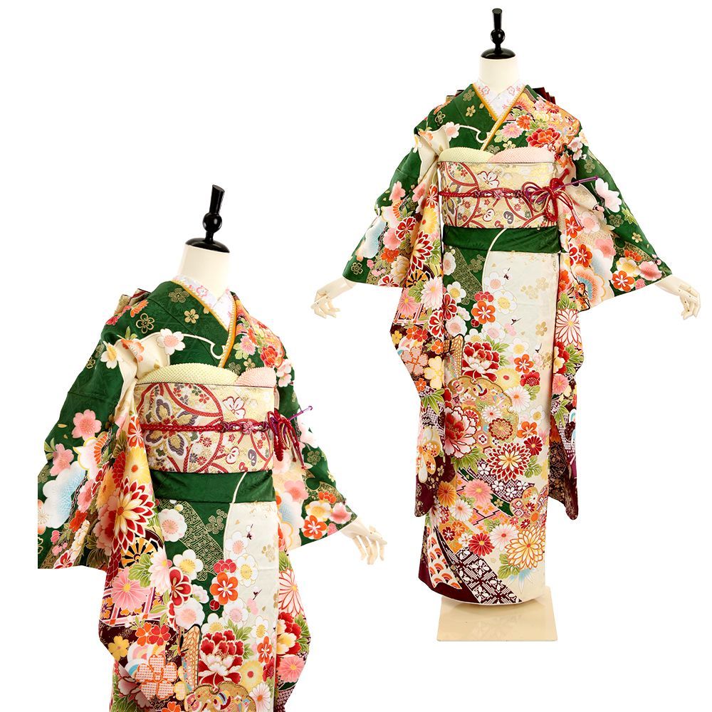 振袖 振袖フルセット 振袖セット 緑 古典柄 熨斗 7点フルセット レディース Lサイズ WA-F-7