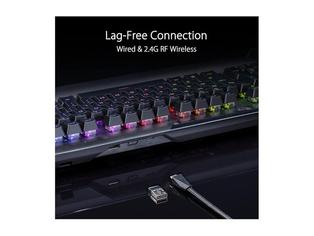 ROG RXオプティカルメカニカルスイッチ:RX Redスイッチはセントラルライティング機能を備え、低遅延でブレのない安定したキーストロークを実現 ●遅延のない接続: 有線または2.4 GHzワイヤレス接続の両方に対応した、わずか1ミリ秒の高速応答