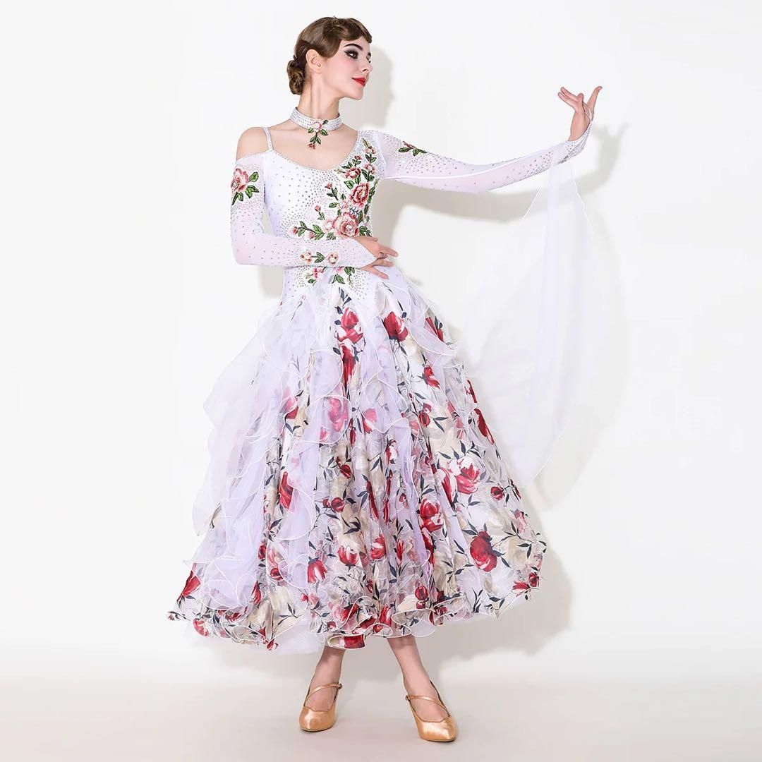 華やかな花柄が目を引くスタンダードドレスで、発表会やデモ、競技会に最適。唯一無二のデザインで、他の人と被らない貴方だけの特別な一着を手に入れてください!