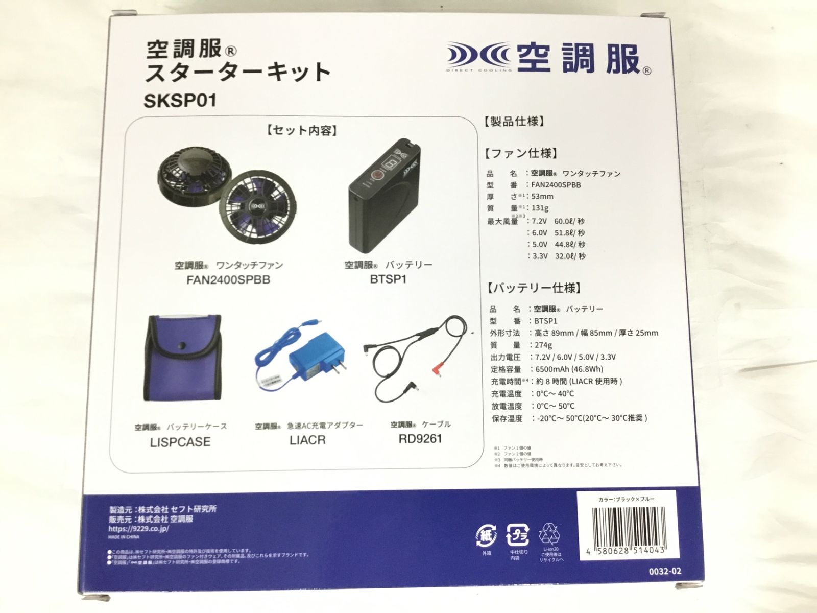 キット内容/バッテリー(BTSP1)、ファン2個(FAN2400SPBB)、ケーブル(RD9261)、アダプター(LIACR)、バッテリーケース(LISPCASE)、バッテリーの落下防止ひも