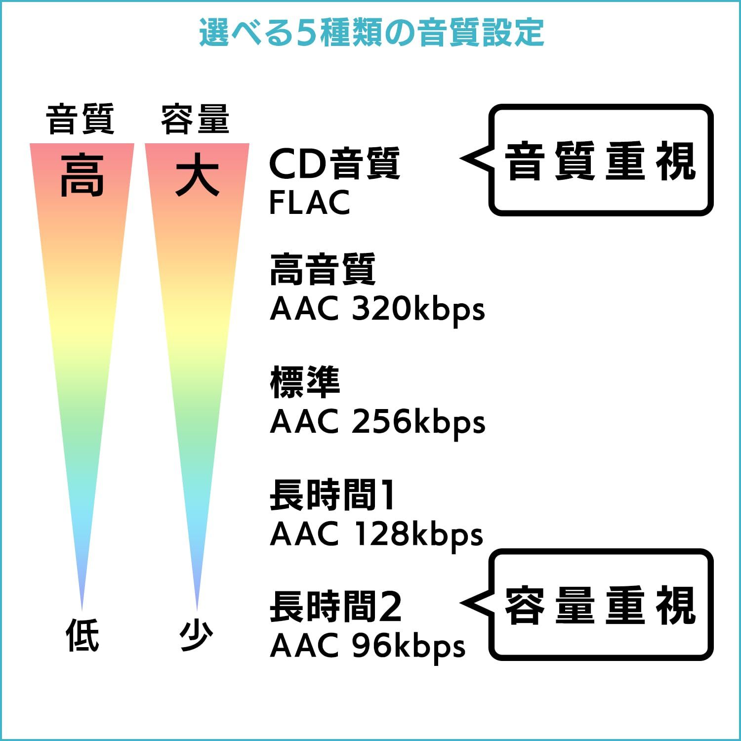 【選べる5種類の音質設定】標準音質(256kbps)を含め、5つの音質設定がありますので、用途に応じてCDを取り込むことができます。例えば、CD音質をスマホで聴きたい時はFLACを選択、スマホの容量を節約したいときは、長時間2(AAC96kbps)を選択できます。