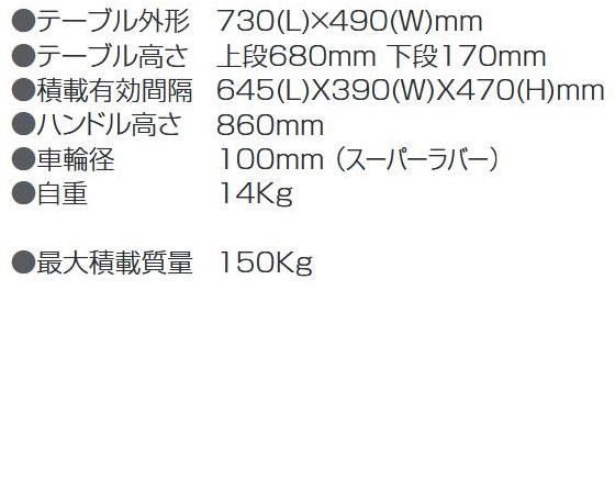 静音台車 テーブル2段式 最大積載量150 kg ストッパー付 PLA 150 T 2 DS