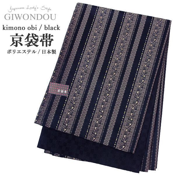 京袋帯 お太鼓 一重太鼓 黒 シャンパンゴールド 縞 アラベスク 唐草 リバーシブル ポリエステル 仕立て上がり 女性 帯 着物 20代 30代 40代 50代 60代 70代