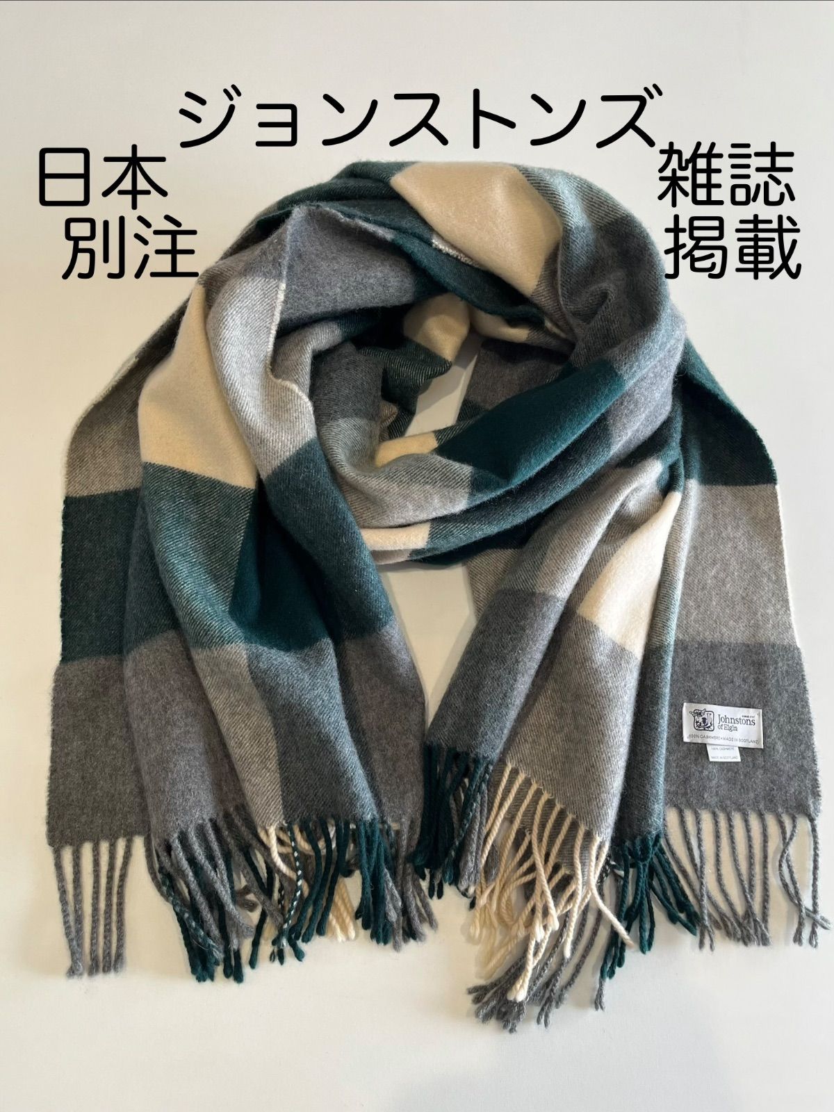 ジョンストンズ カシミヤ 大判ストール ブロックチェック グリーン 別注