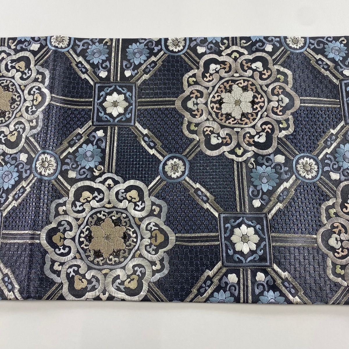 袋帯 華文 花唐草 刺繍 銀糸 青灰色 六通 正絹
