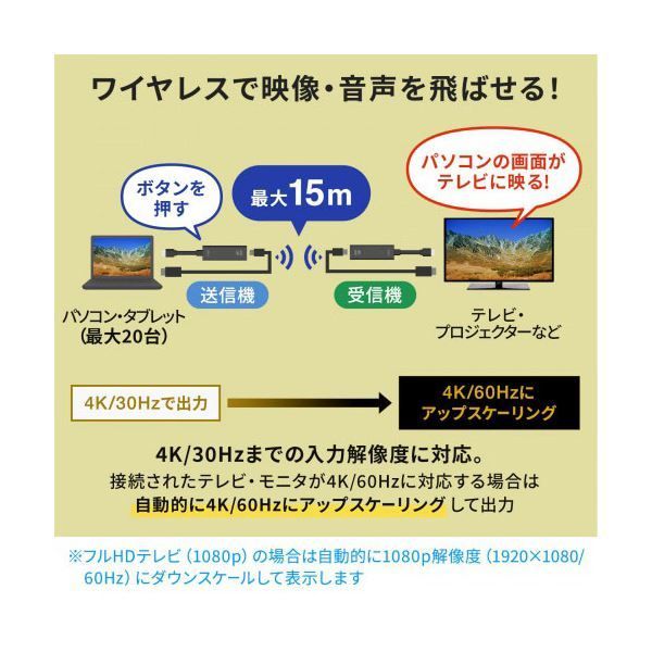 本製品は4K/60Hzの高解像度映像出力に対応しますが映像をワイヤレスで伝送する特性上、有線接続と同レベルの高画質で表示することはできません。