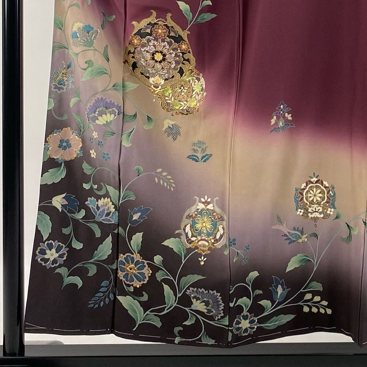 訪問着 身丈156.5 cm 裄丈64.5 M 袷 草花 華文 金彩 螺鈿 赤紫 正絹