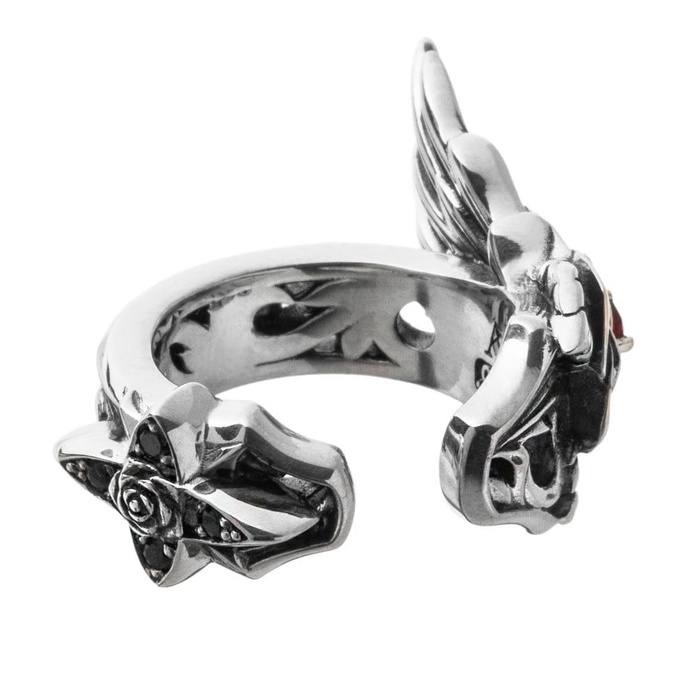 A single bloom taking flight. The Rose Ear Cuff layers wings, arabesque scrolls, and a sculpted rose into a striking miniature sculpture, crowned with a deep red natural garnet. From the rise of each petal to the feathered tips, every contour is crisply rendered; the interplay of mirror-polished silver and subtle oxidation adds dramatic depth. Though the silhouette is bold, the inner curve follows the ear for a light, secure fit.