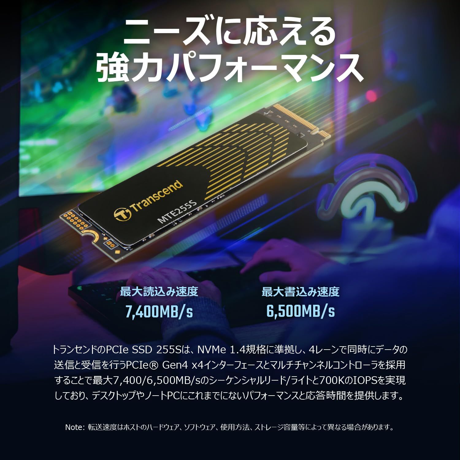 [製品特徴] : トランセンドのPCIe SSD 255Sは、快適なコンピューティング体験を求める動画編集者、ゲーマー、ソフトウェアエンジニア等にとって理想的なソリューションです。NVMe 1.4規格に準拠し、4レーンで同時にデータの送信と受信を行うPCIe Gen4 x4インターフェースとマルチチャンネルコントローラを採用することで最大7,400/6,500MB/sのシーケンシャルリード/ライトと700KのIOPSを実現しており、安定した超高速パフォーマンスを実現します。