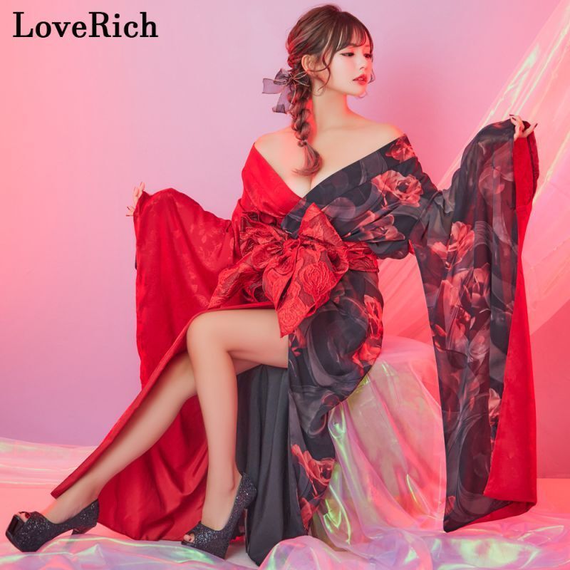 LoveRich ラブリッチ ライン 2点セット バイ 総花柄 サテン&シフォン オフショル ツートン 豪華 帯 花魁 着物 ドレス コスプレ イベント 1308