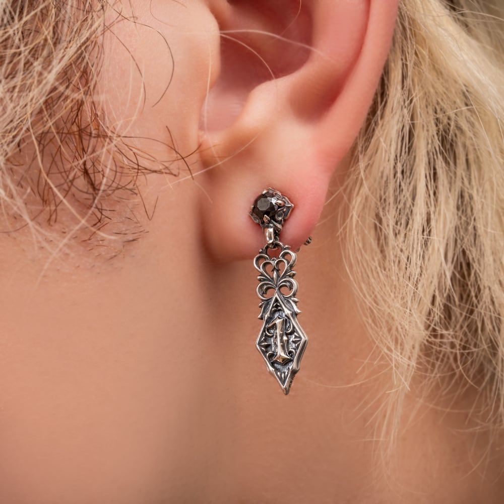 漆黒の石の煌めきを宿すスタッドに、揺れる菱形のプレート。その中央に刻まれた「1」は、ただの数字ではなく、頂点を目指す意志と誇りを象徴しています。唐草模様で美しく装飾されたその姿は、伝統的な意匠にモダンな解釈を重ねたアートピース。裏面には王冠と唐草を配し、細部に至るまでブランドの美学を宿しました。ピアスキャッチはアルテミスキングスを象徴する王冠モチーフ。サイドには〈AK〉と〈925〉の刻印が輝き、真のクオリティを証明します。熟練の職人がブランド監修のもとアトリエ工房で一点ずつ仕立てるサヴォワフェール(職人技)。その洗練された造形は、日常を超えて“勝利と美意識”を耳元に纏わせます。高貴さとエッジを同時に宿した一品は、装う人をより自信に満ちた存在へと引き上げるでしょう。