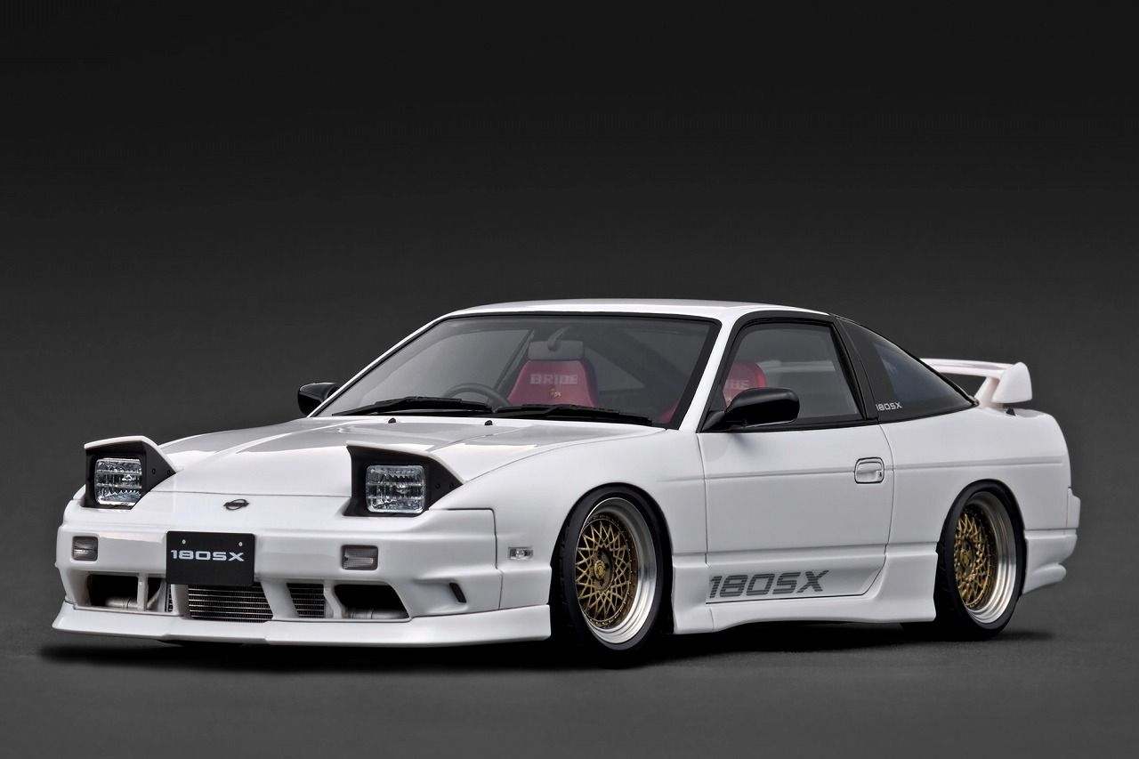 「180SX TYPE X (RPS13)」を1/18スケールレジンモデルで再現。ボディカラー:ホワイト。PANDEM 6666メッシュタイプ17インチホイール(ポリッシュ&ゴールド)にローダウン仕様。純正エアロパーツ(フロントリップスポイラー、フロントバンパー、サイドステップ、リヤバンパー)、リトラライトオープン、サイドミラー(ブラック)、大径シングルマフラー、左右ドア下に「180SX」ロゴ、大型ブレーキキャリパー(レッド)、ナルディタイプステアリング、バケットシート(レッド)を装着。 ※画像は試作品です。
