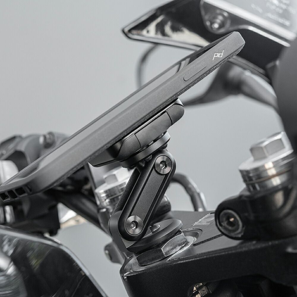 モーターサイクルバーマウントと同様にスマートで頑丈なアルミニウム製で、ヘッド部分の独自機構によりスマートフォンの揺れや振動を防止します。この機能により走行中もスマートフォンを安定させ、さらに振動から守ります。SlimLinkのハードロックによりしっかりとスマートフォンを固定し、また取り外す際にはヘッド部分のプッシュボタンで簡単にロックを解除できます。