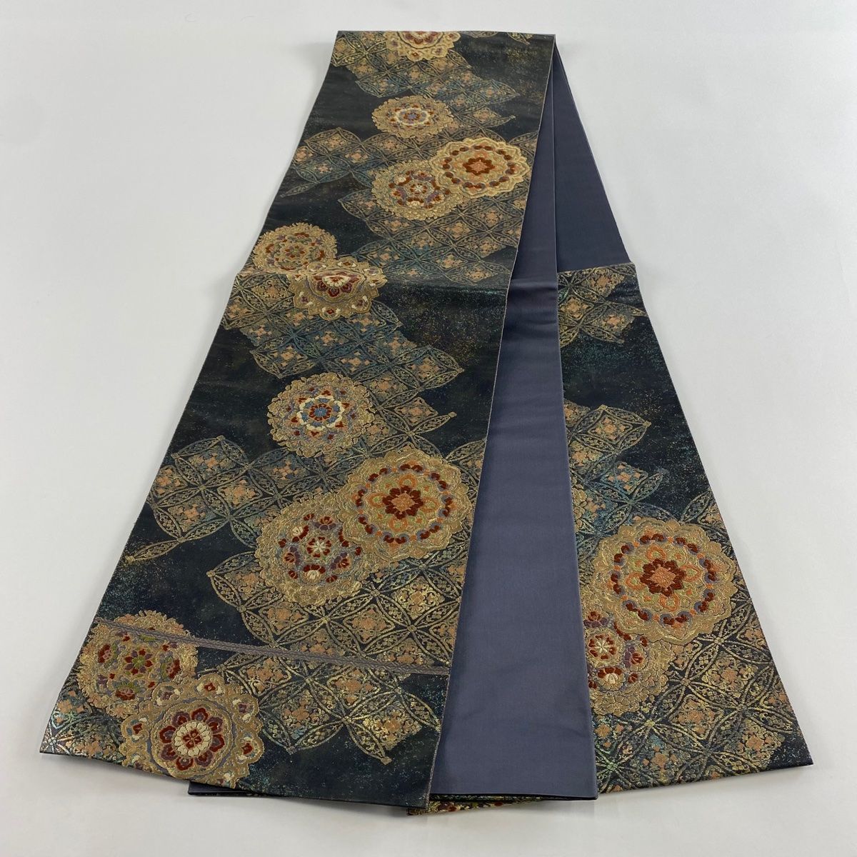 袋帯 秀品 服部織物 落款 華文 七宝 金糸 箔 灰色 六通 正絹